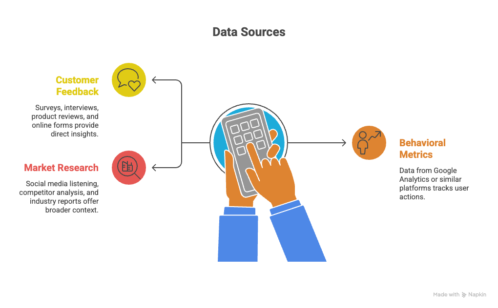 - Direct customer feedback — surveys, interviews, product reviews, and online forms.