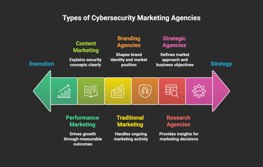 While cybersecurity marketing agencies share a common goal, they differ in how they approach execution and where they create value. Most firms offer some overlap in services, but are typically engaged for a primary function aligned with a company’s needs and stage. They can be classified as: