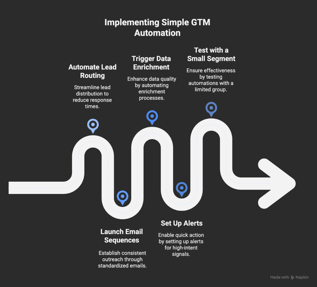 By this point, the foundation is in place, so the next step is to target a few straightforward operational gaps that cause the most friction in everyday go-to-market activities. These are often repetitive tasks that slow lead response or create delays in early engagement. Automating them first gives teams quick, visible improvements and builds confidence in the GTM engineering approach before larger, more complex systems are introduced.