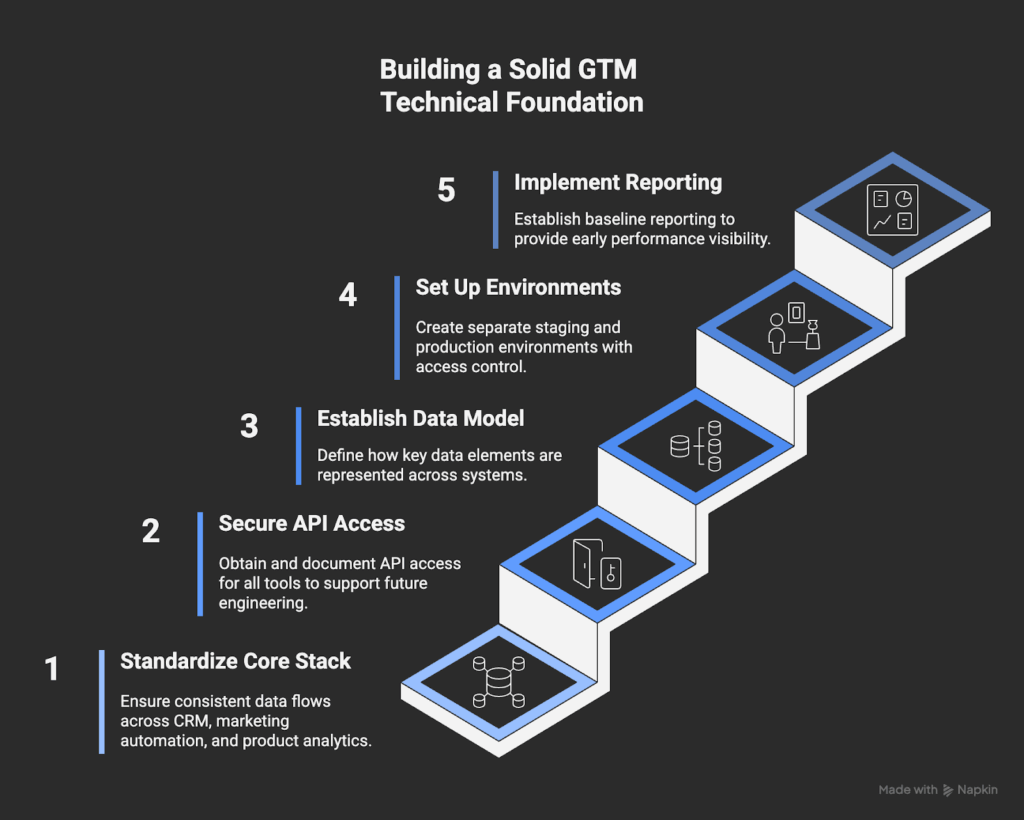 GTM engineering depends on having core systems in place and working correctly before any automation or complex workflows are added. In practice, it means first setting up your CRM as the central source of truth, then connecting it to product analytics and marketing automation platforms, and ensuring basic data flows between them. A solid foundation makes later integrations cleaner and minimizes future rebuilds as your GTM systems evolve.